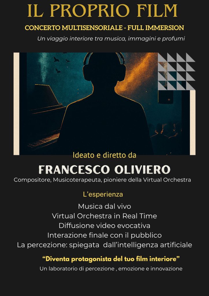 Un concerto multisensoriale e immersivo della durata massima di 45 minuti, per un pubblico limitato o illimitato. Il progetto unisce le competenze artistiche e di ricerca di Francesco Oliviero — compositore, musicoterapeuta, docente e pioniere della Virtual Orchestra — con tecnologie digitali in real time, proiezioni video sincrone e una progettazione olfattiva in stretta relazione con la composizione musicale. Lo spettatore diventa protagonista del proprio film interiore, stimolato attraverso udito, vista e olfatto. L’evento si conclude con un dibattito aperto, supportato dall’intelligenza artificiale che fornisce chiavi di lettura neuroscientifiche.